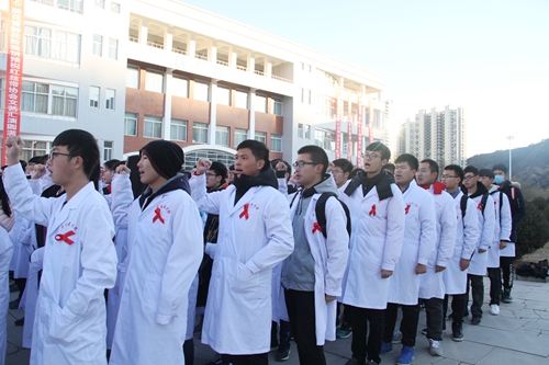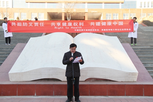 为认真贯彻落实党的十九大精神和推进健康中国战略的总体要求,全面实施《中国遏制与防治艾滋病“十三五”行动计划》,积极响应河北省教育厅《关于认真做好2017年“世界艾滋病日”宣传教育活动的通知》,营造师生共同参与艾滋病防治宣传工作的良好氛围,我校学生处指导大学生红丝带协会于2017年12月1日下午在学校明德广场举办了世界艾滋病日校园宣誓签名活动。纪委张亚平书记,党委宣传统战部部长于多珠,高等医学教育研究室副主任杜少杰,承德市疾控中心性病艾滋病科郭斌科长等相关人员及基础医学院2017级辅导员老师、全体学生参与此次活动。此次活动由团委副书记李春阳主持。