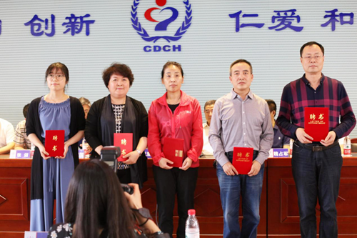 副会长王佩琛(右一)、秘书长纪凤双(右二)、副会长陈建华(右三)、副会长暴宏伶(左二)、副秘书长李姣莹(左一)上台领取聘书。