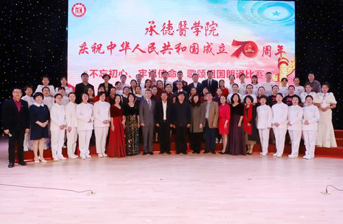 领导、评委、选手合影 70年风雨历程,让烽烟成为过去,让落后成为历史,70年沐风栉雨,让汗水染绿神州,让春天永驻华夏。此次“不忘初心、牢记使命”歌颂祖国职工朗诵比赛,诵出了对新中国的热爱,引导广大师生不忘初心、牢记使命,肩负起谱写时代新篇章的青春使命,凝聚了全校师生的力量。