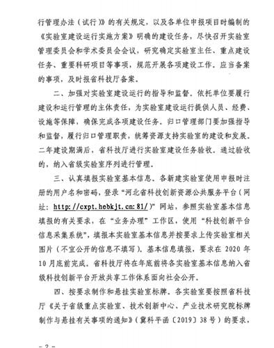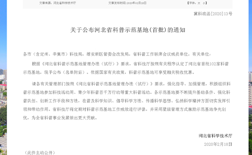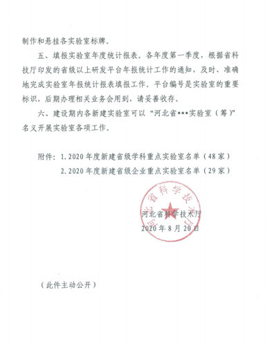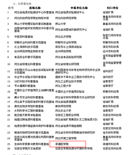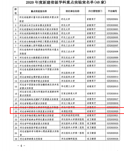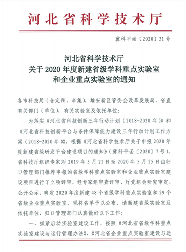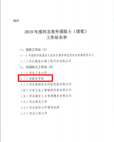 2020年2月,我校申报的“河北省生命科学探索与教育科普基地”获批,是河北省科技厅认定的河北省首批科普示范基地;2020年3月,“承德医学院外国院士工作站”获批;2020年8月,“河北省神经损伤与修复重点实验室”获批,这是我校历史上第二个获批的省级重点实验室。
