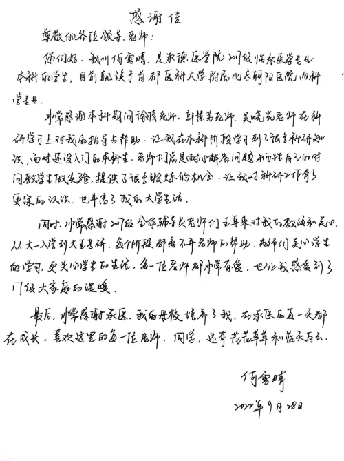 学生的感谢信 可为良师,亦为益友。教学过程往往是需要重复讲述的,即便有些枯燥无味,但在郭慧芳看来,重复讲述的过程也是老师补充知识的好机会,她会根据上节课的反响,一次次不厌其烦地在讲授内容中补充实际案例、科学前沿、思政教育。数次修改,数次讲述,只为学生们丰富知识,扩大眼界。良师亦为友,当郭慧芳谈及她如何与她的学生相处时,她这样说道:“我感觉老师和学生是一个平等的关系,他们有自己独立的思想,是一个独立的个体,作为老师我要尊重他们,爱护他们,发挥他们的主动性。”自开始教学工作以来郭慧芳一直秉承着师生平等的关系理念,一直和学生亦师亦友般相处,在生活上为学生排忧解难,在学习上用最合适的教学方法教授学生知识。 严于律己,教导有方。一封来自毕业生何雪晴的感谢信,道出了学生对郭慧芳在科研思路、实验操作以及数据统计等方面给予指导和帮助的感激之情,道出了郭慧芳的责任之心。采访中,郭慧芳介绍了她自己的教学理念与独特有效的教育方法:“作为老师,我们就是先要以学生为中心,坚持立德树人的理念,然后找到适合学生理解的教学方法:一是在课程教学中坚持基础与临床相结合,以医学遗传学为例,因为遗传病很少见,课本内容抽象,所以我会在业余时间去附属医院摘录一些真实存在的遗传病例,将病例与课本相结合,用生动的方式将遗传学知识教授给学生;二是加强学生第二课堂活动,我们生物教研室积极举办微课大赛,让七八个同学组成一个小组制作授课微视频,这样生动形象的第二课堂活动可以加强学生对理论知识的理解,加强团队合作能力与思考能力;三是坚持思政教育,立德树人,国家号召思政教育入课堂,所以我们深入挖掘遗传学中蕴含的思政元素,比如制度自信、医者仁心、职业道德。”真正的良师深谙“动人以言者,其感不深;动人以行者,其应必速”的道理,郭慧芳正如此,她在一言一行中将广博的知识,医者的道德展现出来,潜移默化地感染着学生。 千磨万击还坚劲,任尔东西南北风。学习的过程也许是枯燥且艰苦的,很多学生在娱乐活动的诱惑下,精神压力的逼迫下肆意“摆烂”,面对这些正处于学习低谷期,困惑期的同学,郭慧芳用自身事例鼓励他们坚持下去,“之前我做研究时觉得结果不理想一度想要放弃,但我的导师告诉我他带过的很多不如我的学生也都顺利毕业了,为什么要对自己这么没自信呢?不要妄自菲薄。所以当你觉得不如意的时候一定要坚持下去,只要你挺过了那段低谷期,你的思想就会进一步提升,你的人生就是另外一番天地。”不是所有的坚持都有结果,但总有一些坚持,能从冰封的土地里,培育出十万朵怒放的蔷薇。 新竹高于旧竹枝,全凭老干为扶持。教师是人类灵魂的工程师,她用勤奋高洁诠释了师德的内涵,她用博爱胸怀滋润了学生的心灵,她用温柔负责雕琢了每一块璞玉,三尺讲台默默耕耘,杏坛秋意挥洒甘霖。作为学生,我们在之后的求学道路上要常怀一颗感恩之心,让尊师重道的文化更好传承。