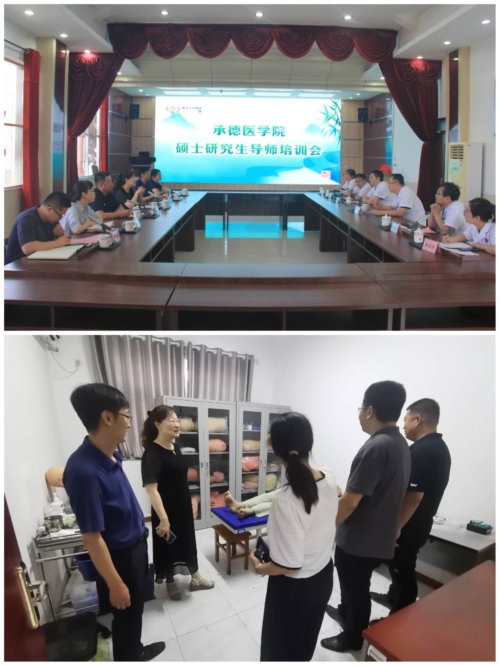 在衡水市人民医院学生座谈、教学检查及实地考察 在衡水市中医医院,医院党总支书记杜毅龙致欢迎词,表示此次挂牌是医院提升综合素质、加快发展的新起点,将实现学校和医院共同发展、互惠共赢的大好局面。科教科科长许健详细汇报了衡水市中医医院整体情况,以及近年“住培”工作的具体情况。陈志宏介绍了我校的基本情况及研究生教育发展、取得的成绩,表示此次揭牌是联合培养研究生的大事,必将会推动学校的研究生教育,同时医院的临床医疗和科研水平也将实现跨越式发展。陈志宏和杜毅龙为承德医学院研究生培养基地揭牌。随后,进行了硕士研究生导师培训,并实地考察了医院条件。