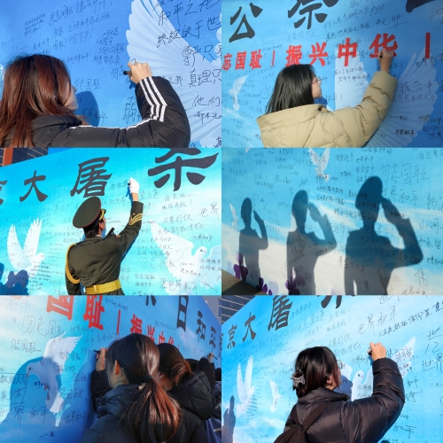 降半旗仪式 每一次对历史的回望,如同点亮一支民族精神的火炬。刺耳的警报声再次响起,警醒华夏儿女牢记历史、珍爱和平,凝聚矢志复兴的磅礴力量。上午10时,我校国旗护卫队以铿锵有力的步伐,护送着鲜艳的五星红旗入场。伴随着庄严的国歌声,五星红旗缓缓升起,升旗仪式结束后,举行降半旗仪式,全体师生肃立,共同为南京大屠杀中不幸遇难的同胞默哀,校园内弥漫着庄重而肃穆的气氛,每一位师生都能深切感受到历史的回声在耳边回荡,警钟之声在心中长鸣。随后进行了庄重的宣读祭文环节,一字一句,饱含着对历史的铭记和对死难者的缅怀。最后,师生们纷纷在南京大屠杀死难者国家公祭日和平许愿墙上签下和平愿望,表达对和平的珍视与追求。