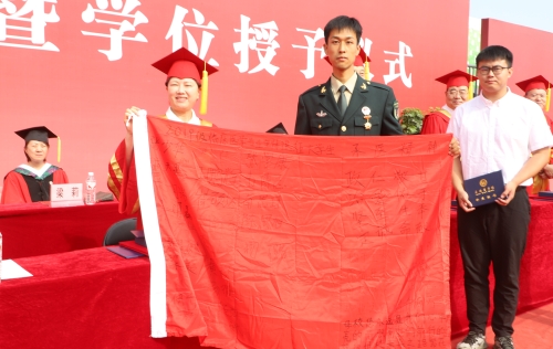 退伍大学生毕业生代表将2024届全体退伍大学生签名的旗帜献给母校以表感谢 2019级临床医学专业金心代表毕业学生发言,追忆与学校共同成长进步的点滴,并表示将会带着对医学事业的热爱和执着,牢记母校的教诲和嘱托,秉承“政治坚定、仁爱至诚、敬佑生命、甘于奉献”的承医精神,奋斗拼搏,勇毅前行。