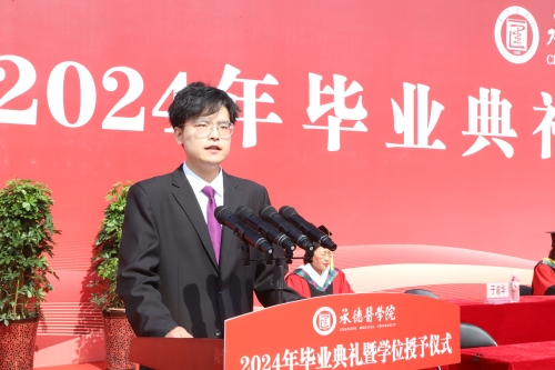 基础医学院教师谢广成代表全体教师发言 唐世英代表学校党政领导致辞,祝贺2024届毕业生们顺利完成学业,开启崭新篇章。勉励毕业学生,要走正路、行大道,不被浮华所迷惑、不为功利所裹挟。一要树立“须知少时凌云志,曾许人间第一流”的远大理想,把个人理想、和人生同祖国的前途、民族的命运紧密联系在一起,在有益于国家、有益于人民、有益于医疗卫生事业的壮阔征程中,成就人生理想。二要锤炼“人生万事须自为,跬步江山即寥廓”的奋进精神,不要太在意一时之快慢、一事之成败,敢于以坚定者、搏击者的姿态面对困难考验,积小胜为大胜,创造出彩人生。三要永葆“少年易老学难成,一寸光阴不可轻”的勤学之风,要始终牢记“仁爱至诚”、始终践行“知行合一”、始终坚持终身学习,切实做到“无一事不学、无一时不学、无一处不学”。四要涵养“不经历风雨,怎能见彩虹”的坚毅品格,敢于用极强的韧性与勇气抵御风险,攻坚克难。