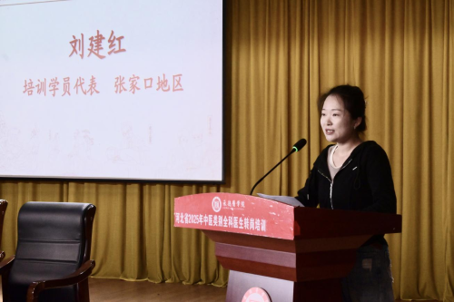 学员代表刘建红发言 中医基础教研室主任熊鑫作为地区负责人代表发言,向全体学员表示热烈祝贺,并充分肯定了大家在培训过程中展现的专注与勤奋。她希望学员们以此次结业为新的起点,持续精进专业能力,充分发挥中医药特色,为夯实基层医疗卫生服务体系、守护百姓健康贡献智慧与力量。
